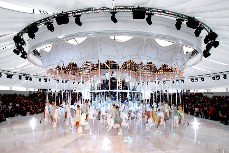 Модели Marc Jacobs на детской карусели во время парижской Недели моды 2011 года.