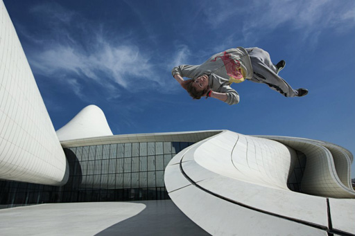 Культурный Центр имени Гейдара Алиева, Дворец Ширваншахов в Ичери Шехер, нефтяные вышки, Театр оперы и балета, Центральная библиотека, башни Филармонии, крыши старого Баку - вот некоторые из знаковых мест столицы Азербайджана, где 28-летний британский спортсмен Райан Дойл совершил свои уникальные прыжки, "флипы" и "спины" во время своего незабываемого путешествия.