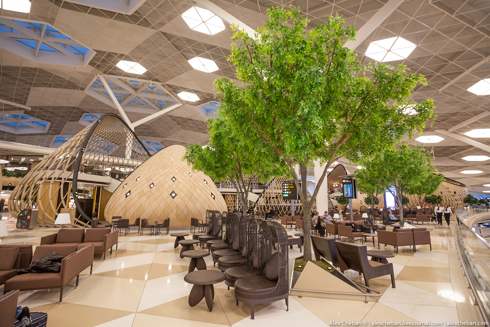 Четыре этажа здания на всех уровнях обвиты изнутри конструкциями своеобразных "коконов", изготовленных из дубового шпона, а кафе, бары, торговые киоски в бизнес-зоне Salam Lounges на верхнем этаже архитекторы спрятали в деревянные полусферы.
