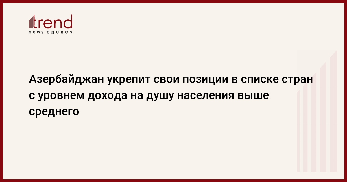 Азербайджан с 2008 года входит в состав стран с уровнем доходов на душу населения выше среднего. По методологии Всемирного банка, в эту категорию относятся страны с уровнем дохода на душу населения в пределах от 3946 до 12195 долларов.