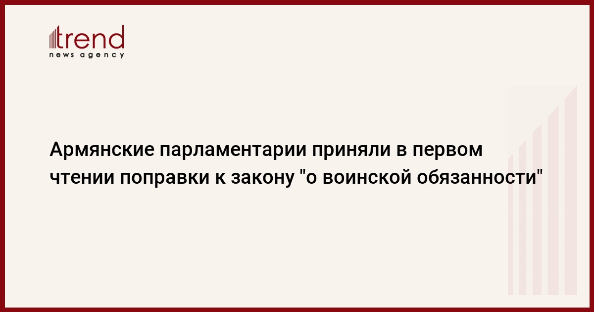 Армянские парламентарии приняли в первом чтении пакет поправок к закону "О воинской обязанности" и ряду других законов, передает АРКА. Как сообщил, представляя в парламенте поправки, заместитель министр обороны Армении Ара Назарян, законопроект предлагает уравнять права обучаемых по госзаказу в научно-образовательных учреждениях иностранных государствах граждан, а также воспитанников судебной школы в вопросе получения права отсрочки и призыва по исполнении 27 лет или завершении аспирантского обучения.