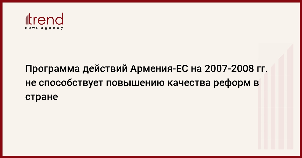 График реализации мероприятий по Программе действий Армения-ЕС в рамках политики "Новое соседство" на 2007 и 2008 гг. не способствует повышению качества процесса реформирования в различных областях жизни страны. Об этом заявила в четверг в Ереване исполнительный директор армянского филиала Фонда содействия Института открытого общества, член инициативы "Партнерство во имя открытого общества" Лариса Минасян, передает Новости-Армения.