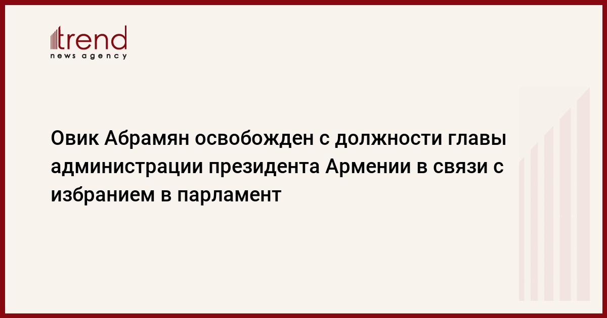 Президент Армении Серж Саргсян подписал 5 сентября указ об освобождении Овика Абрамяна с должности руководителя администрации президента, сообщили в субботу агентству "АРКА" в пресс-службе главы армянского государства.