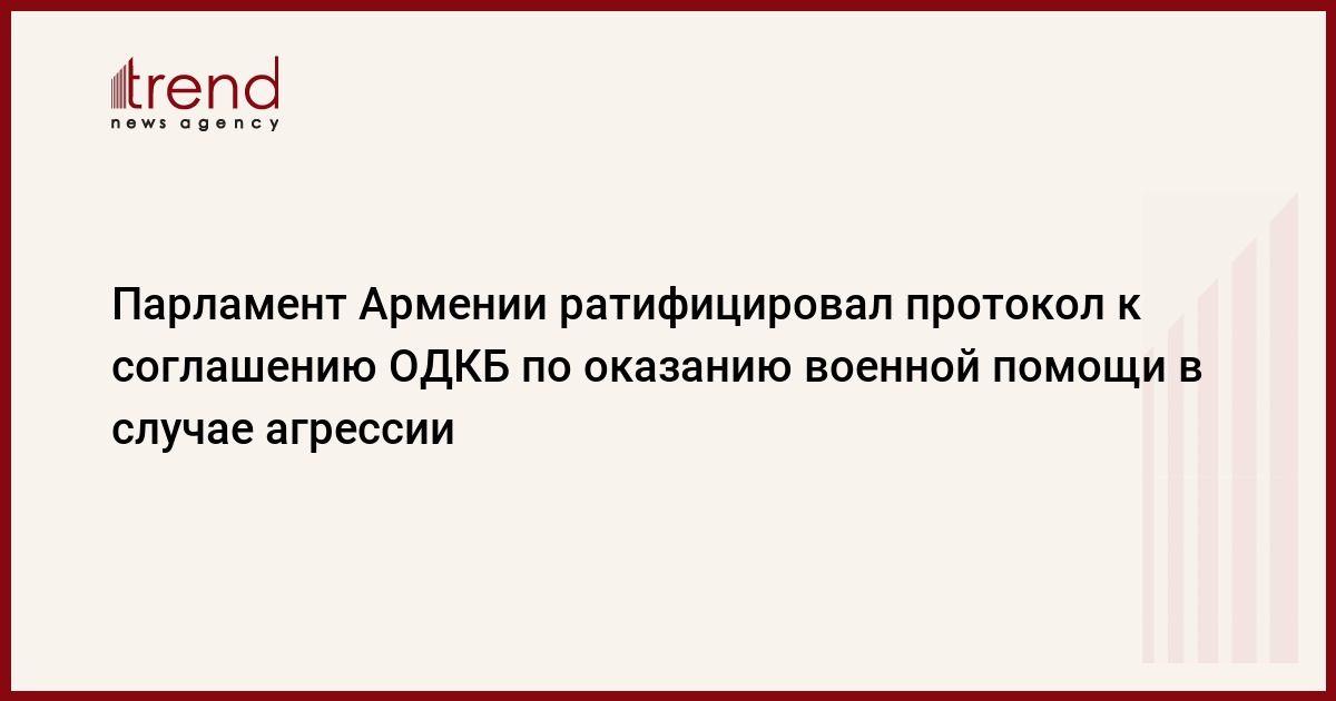 Депутаты Национального собрания Армении ратифицировали сегодня протокол к соглашению "О механизме оказания военно-технической помощи государствам - членам Организации Договора о коллективной безопасности (ОДКБ) в случае возникновения угрозы агрессии или совершения акта агрессии". "Агрессия против одной из стран - членов ОДКБ будет рассматриваться как акт агрессии против остальных", - подчеркнул замминистра обороны Армении Ара Назарян, передает АРМИНФО.