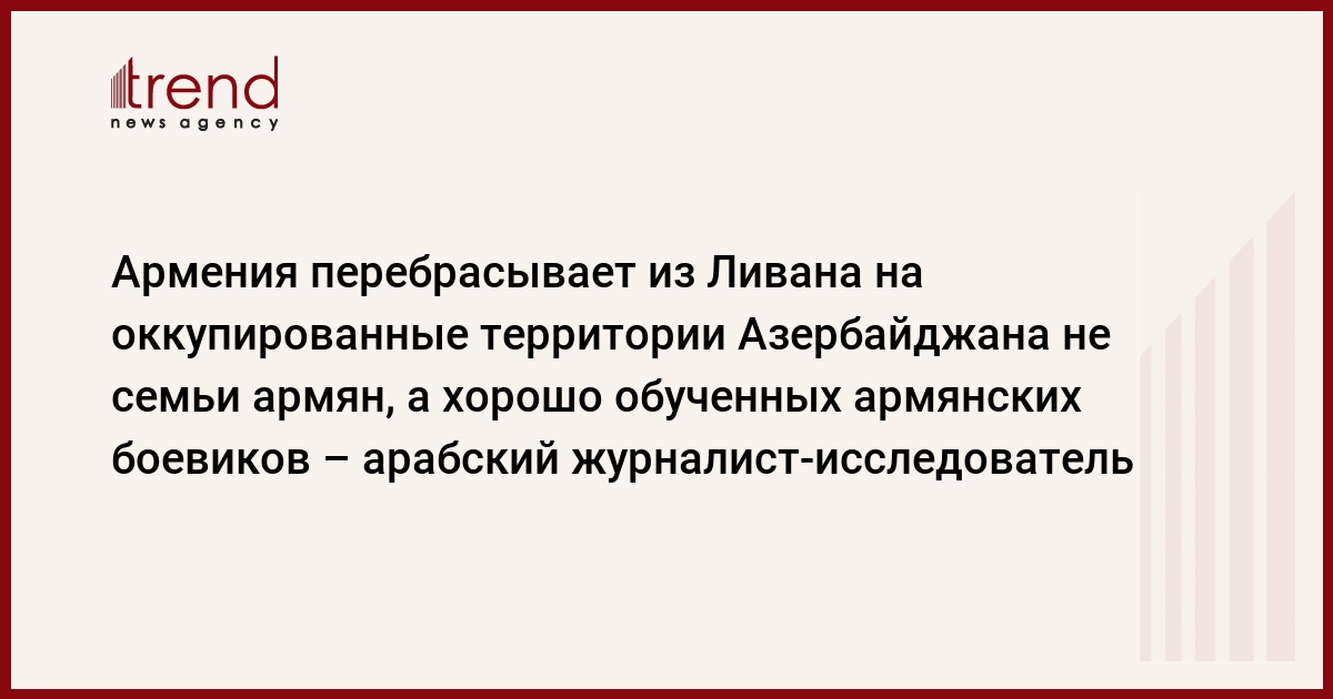 БАКУ /Trend/ - Армения перебрасывает из Ливана на оккупированные территории Азербайджана не семьи армян, а хорошо обученных армянских боевиков. Об этом сказал Trend известный арабский журналист-исследователь, эксперт по Южному Кавказу Абдуль-Хамид Гутуб.