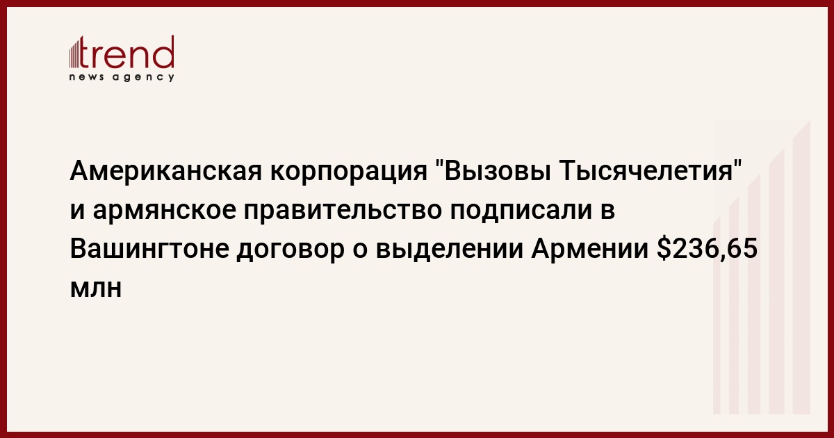 Как передает Trend , со ссылкой на "Медиамакс" сегодня в пресс-службе посольства США в Армении сообщили что, с армянской стороны договор о выделении Армении $236,65 млн. подписал министр финанов и экономики Вардан Хачатрян, с американской - исполнительный директор МСС Джон Данилович.