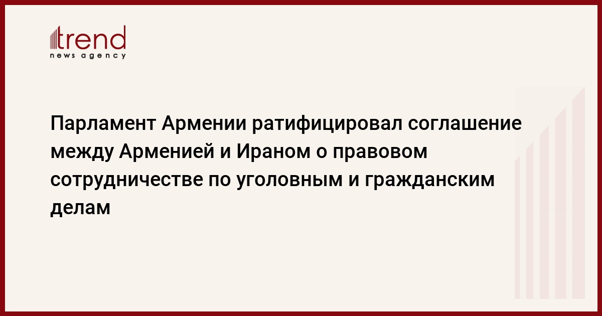 Парламент Армении ратифицировал в среду армяно-иранское соглашение о правовом сотрудничестве по уголовным и гражданским делам. Как заявил в парламенте министр юстиции Армении Давид Арутюнян, соглашение устанавливает рамки правового сотрудничества между договаривающимися сторонами, сообщает Trend со ссылкой на АРКА.