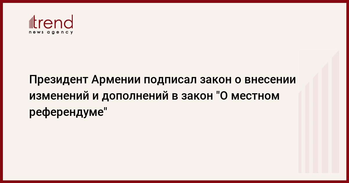Президент Армении Роберт Кочарян накануне подписал закон о внесении изменений и дополнений в закон "О местном референдуме". Об этом агентству "АРКА" сообщили в пресс-службе президента РА.