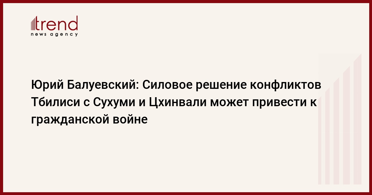 Силовое решение грузино-абхазского и грузино-осетинского конфликтов может привести к гражданской войне. Такое мнение высказал журналистам начальник Генерального штаба Вооруженных сил РФ генерал армии Юрий Балуевский, передает РБК . "На мой взгляд, решение этой проблемы грузинской стороной подразумевается, в том числе, и силовым путем", - сказал он.