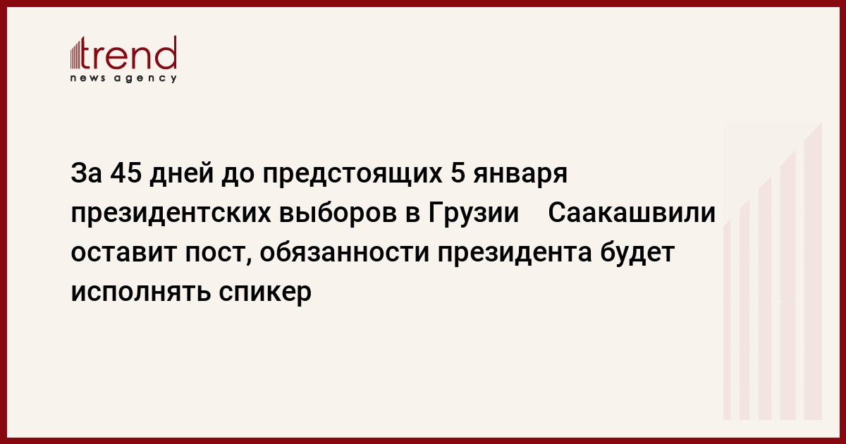 22 ноября - за 45 дней до предстоящих 5 января президентских выборов. Обязанности главы государства до подведения итогов голосования будет исполнять спикер парламента Нино Буpджанадзе - второе по рангу лицо в стране. Об этом сообщил сегодня вице-спикер парламента, один лидеров правящей в стране партии "Единое национальное движение" /ЕНД/ Михаил Мачавариани, передает ИТАР-ТАСС .