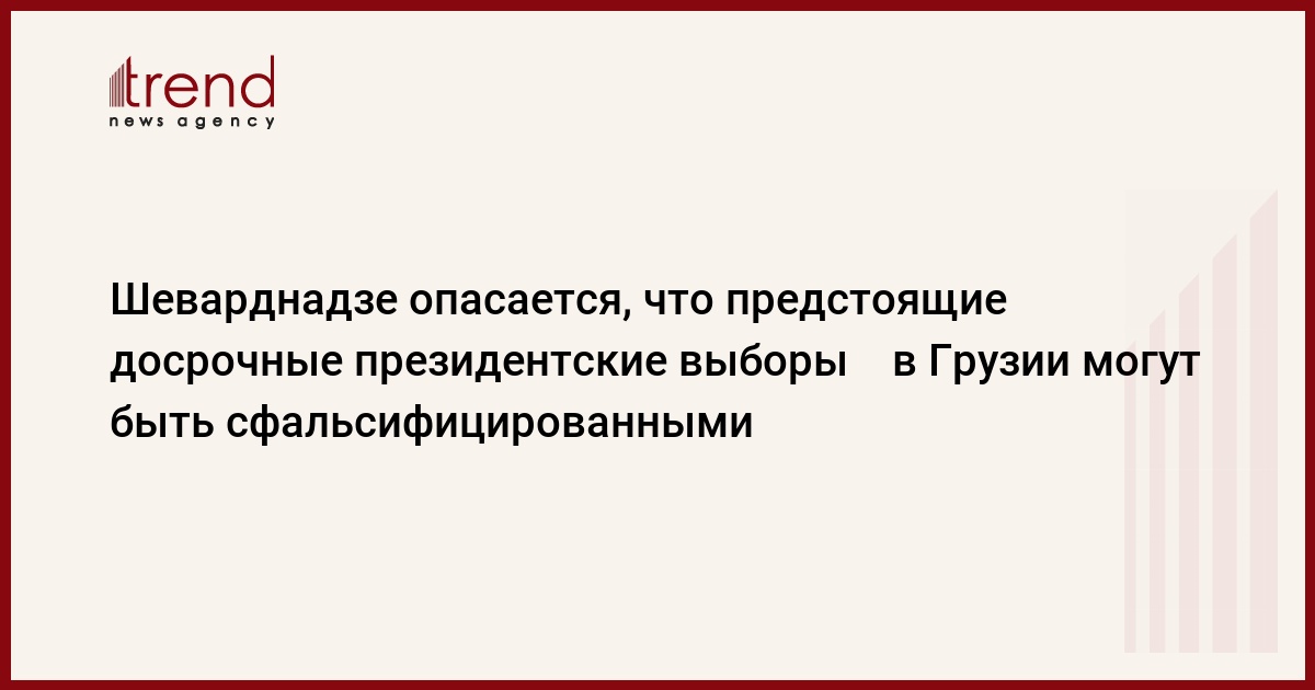 Экс- президент Грузии Эдуард Шеварднадзе опасается, что предстоящие у него на родине 5 января досрочные президентские выборы могут быть сфальсифицированными. Бывший лидер Грузии заявил об этом в интервью, опубликованном сегодня в газете "Хандельсблат", передает ИТАР-ТАСС .