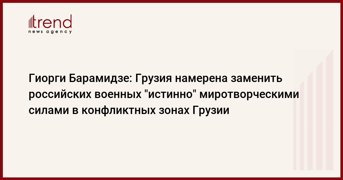 Грузия, Тбилиси /корр. Trend Н.Кирцхалиа/ Грузия намерена добиться ввода в зоны конфликта в Грузии "истинных" миротворческих сил. Об этом заявил грузинским журналистам находящийся в Ашхабаде вице-премьер, госминистр Грузии по евроинтеграции Гиорги Барамидзе. Российские военнослужащие не являются миротворческим контингентом, сказал он.