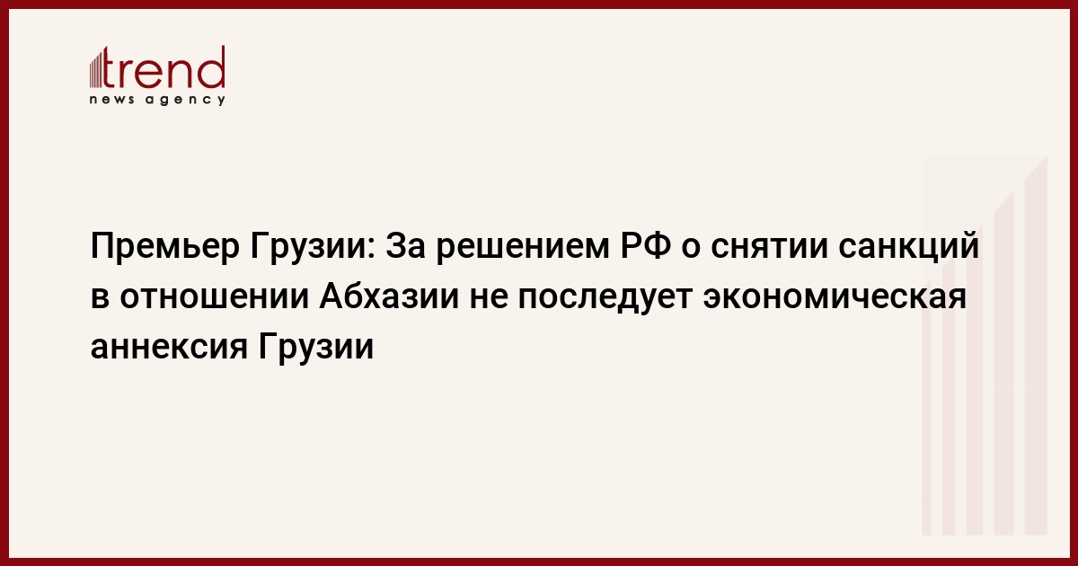 Премьер-министр Грузии Владимир Гургенидзе не считает, что вслед за решением России в одностороннем порядке упразднить санкции в отношении Абхазии последует экономическая аннексия Грузии, сообщает РБК. "Я далек от мысли, что это повлечет за собой экономическую аннексию Грузии. Конечно, этого не случится", - сообщил он сегодня журналистам. Премьер выразил сожаление, что такое заявление вообще было сделано. По его мнению, одностороннее снятие санкций является "недружественным шагом" в отношении Грузии. "Наверно, это один из отголосков косовского процесса", - сообщил В.Гургенидзе.