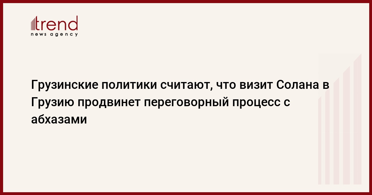 Грузия, Тбилиси, 29 мая /корр. Trend Н.Кирцхалиа/ Визит в Грузию верховного комиссара Евросоюза Хавьера Солана и его поездка в Абхазию 6 июня будет служить мирному урегулированию грузино-абхазского конфликта, заявил журналистам председатель парламентского комитета по внешним связям Коте Габашвили, комментируя сообщения о визите Еврокомиссара.