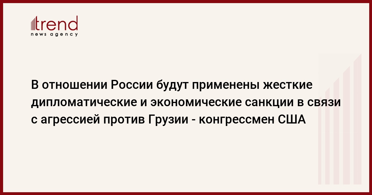 Грузия, Тбилиси, 20 августа /корр. Trend Н.Кирцхалиа/ Из-за агрессии, осуществленной против Грузии, к России будут применены жесткие дипломатические и экономические санкции. Об этом заявил находящийся в Грузии американский конгрессмен Крис Смит.
