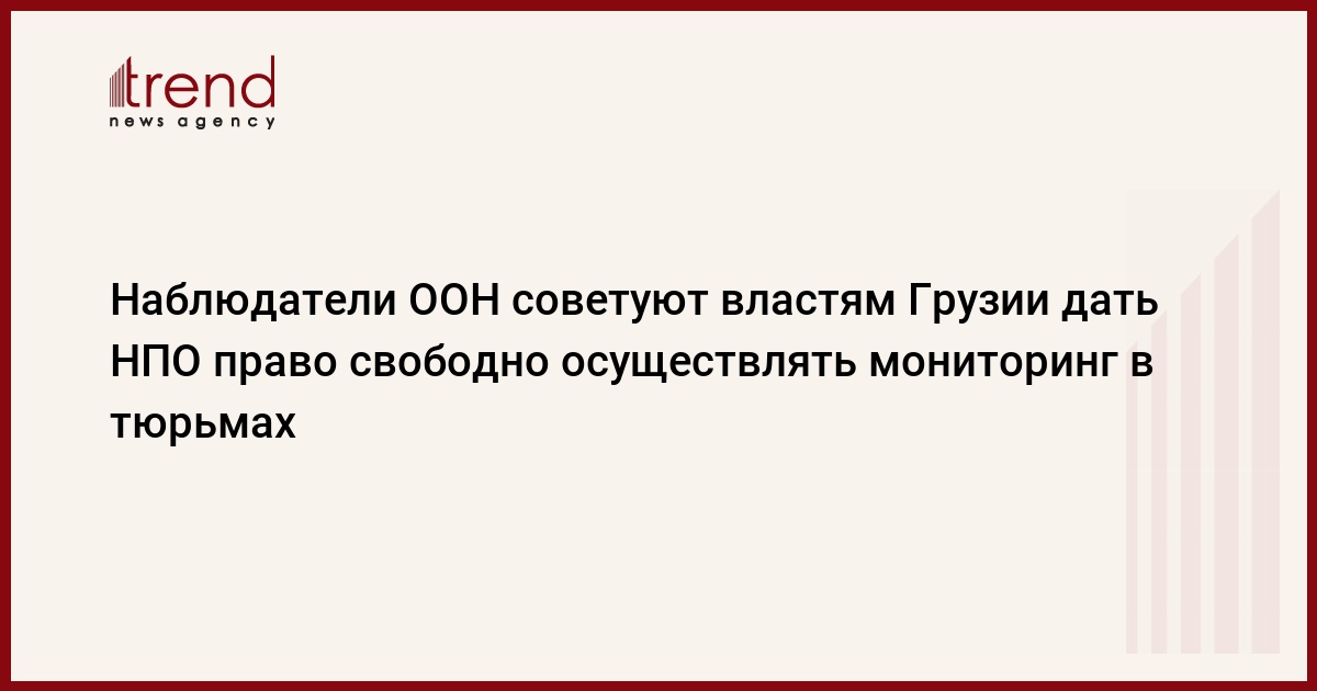 Наблюдатели ООН советуют властям Грузии дать неправительственным организациям право свободно осуществлять мониторинг в уголовно-исполнительной системе. Как заявила 21 мая на пресс-конференции в Тбилиси по итогам визита Верховный комиссар организации по правам человека Нави Пиллэй, ситуация в пенитенциарной системе Грузии улучшилась, но осуществление реформ в этой сфере все же необходимо.