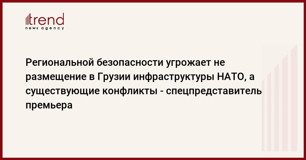 ТБИЛИСИ /Trend/ - Региональной безопасности угрожает не размещение инфраструктуры НАТО в Грузии, а существующие в регионе замороженные конфликты. Об этом заявил в четверг специальный представитель премьера Грузии по грузино-российским отношениям Зураб Абашидзе, комментируя заявление МИД России.