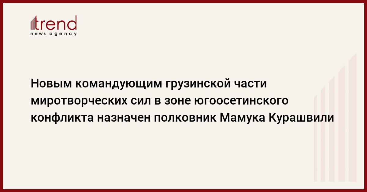Новым командующим грузинской части Смешанных сил по поддержанию мира /ССПМ/ в зоне югоосетинского конфликта назначен полковник Мамука Курашвили. Об этом корр. ИТАР-ТАСС сообщили сегодня в Минобороны Грузии. Он занял этот пост вместо Пааты Бедианашвили, который в декабре 2006 года был переведен на должность начальника базы вооружения и боеприпасов управления логистического обеспечения МО Грузии.