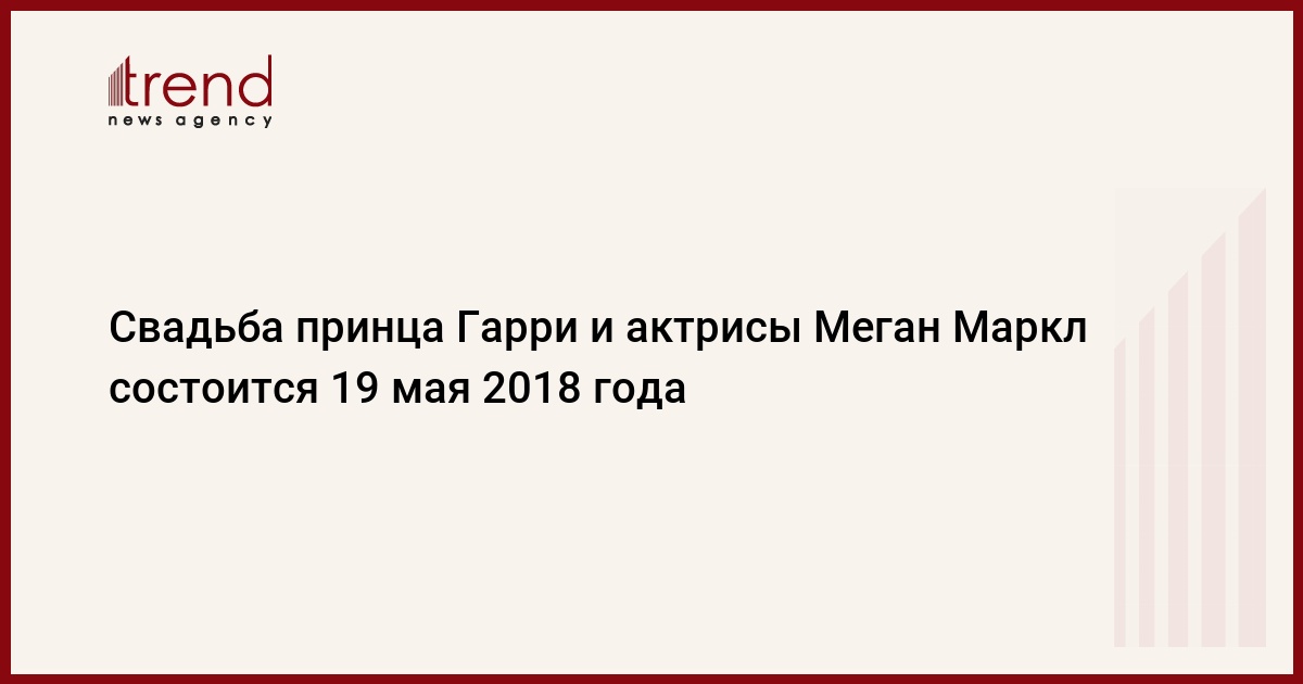 Свадьба британского принца Гарри и американской актрисы и фотомодели Меган Маркл состоится 19 мая 2018 года. Об этом в пятницу в Twitter сообщила канцелярия Кенсингтонского дворца, на территории которого проживает пятый в очереди наследник британского престола, передает ТАСС.