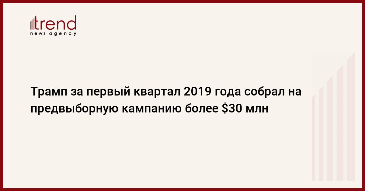 Дональд Трамп за первый квартал 2019 года собрал более $30 млн в качестве пожертвований на проведение своей кампании по переизбранию на пост президента США на выборах 2020 года. Об этом сообщает Trend со ссылкой на Агентство ТАСС