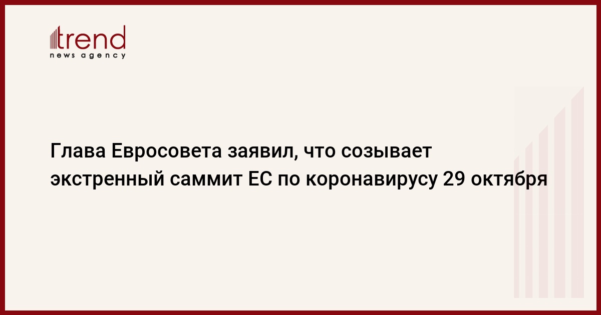 Председатель Евросовета Шарль Мишель принял решение созвать на 29 октября экстренный саммит глав государств и правительств Евросоюза в формате видеоконференции, чтобы обсудить меры по борьбе с пандемией заболевания, вызываемого новым коронавирусом. Об этом он сообщил в среду у себя в Twitter, передает Trend со ссылкой на ТАСС.
