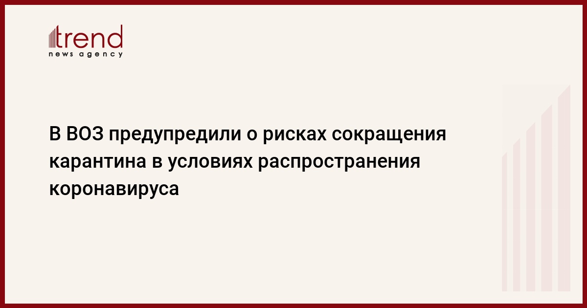 Сокращение продолжительности карантина с 14 до 10 или семи дней для людей, контактировавших с носителями коронавируса, повышает риск передачи инфекции, однако государства идут на такой шаг по экономическим и социальным причинам. Об этом заявила в среду в ходе сеанса вопросов и ответов, транслировавшегося в Twitter на странице Всемирной организации здравоохранения (ВОЗ), ее эксперт Мария ван Керкхове, передает Trend со ссылкой на ТАСС.