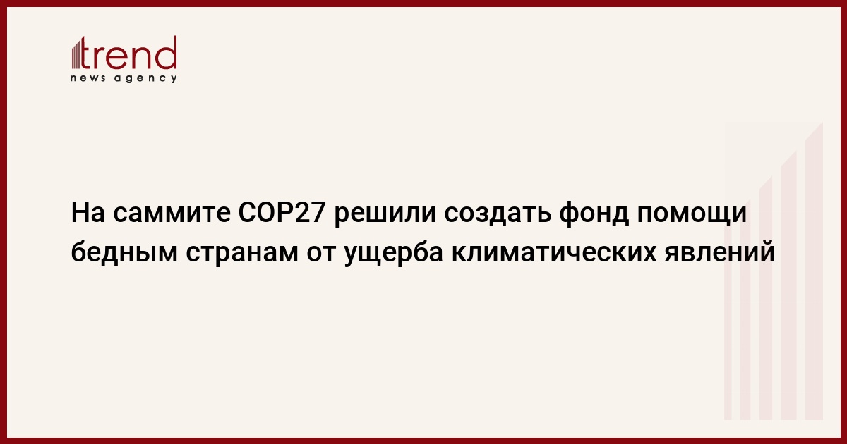 Участники конференции ООН по климату COP27 в субботу на переговорах достигли договоренности о создании фонда для особо уязвимых стран, который будет направлен на компенсацию ущерба, вызванного климатическими изменениями, передает The Wall Street Journal (WSJ) со ссылкой на информированные источники, передает Trend со ссылкой на Интерфакс.