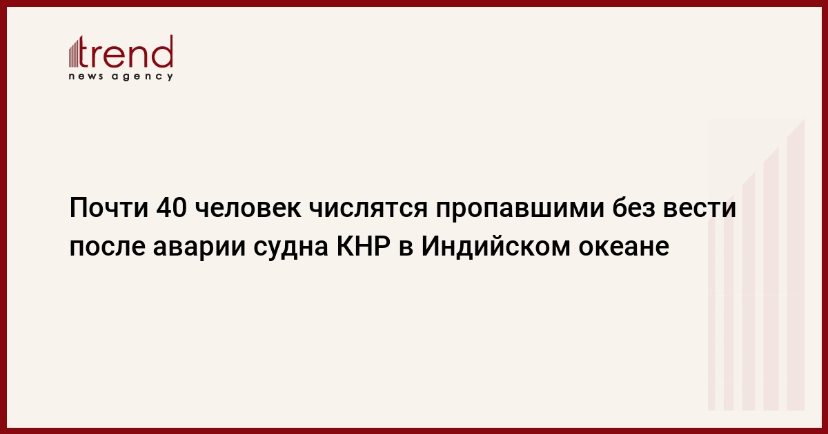 Китайское рыболовецкое судно Lupenglaiyuanyu 8 перевернулось и затонуло в центральной части Индийского океана, все 39 членов экипажа, находившиеся на борту, считаются пропавшими без вести, сообщили государственные СМИ КНР, передает Trend со ссылкой на Интерфакс.