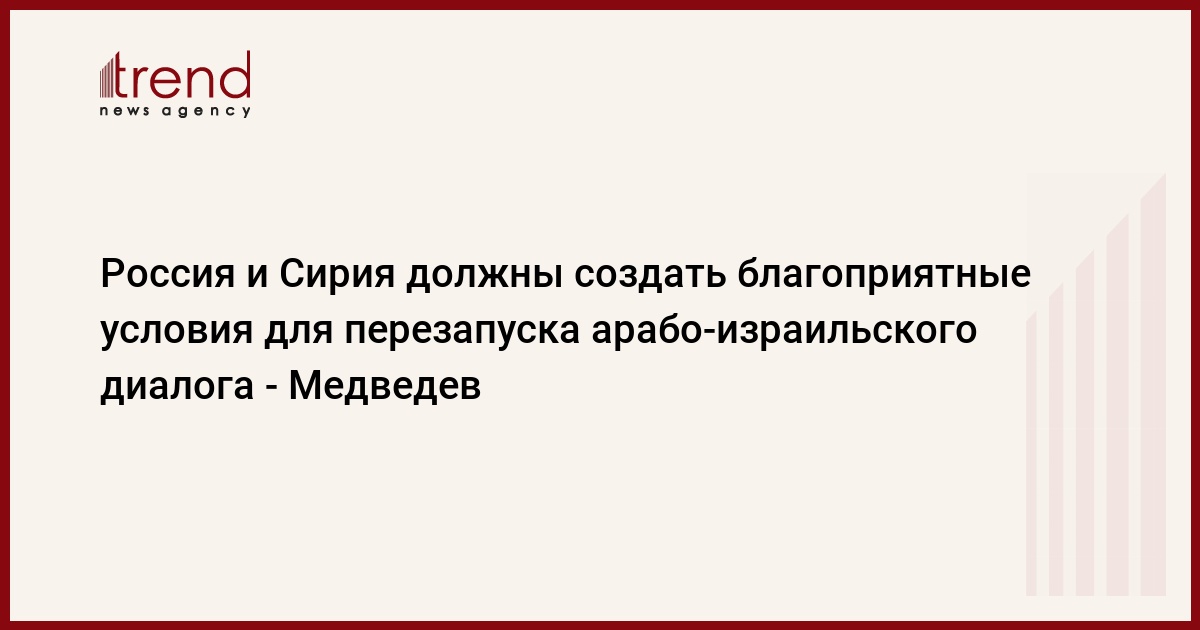 Россия и Сирия, вместе с другими коспонсорами ближневосточного процесса, должны создать благоприятные условия для перезапуска арабо-израильского диалога, считает президент РФ Дмитрий Медведев, который посетит Дамаск 10-11 мая с визитом, сообщает РИА Новости.