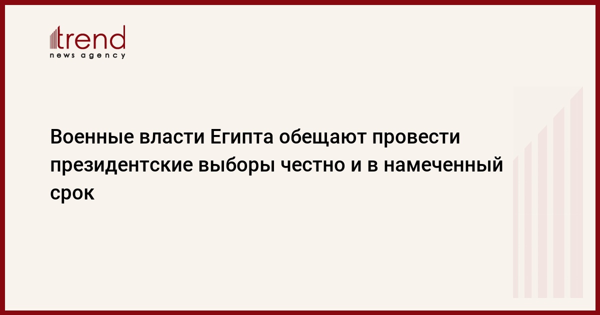 Правящий в Египте Высший совет вооруженных сил в четверг пообещал провести свободные и честные выборы главы государства в срок и призвал граждан страны помочь в создании условий для успешного проведения голосования, передает РИА Новости.