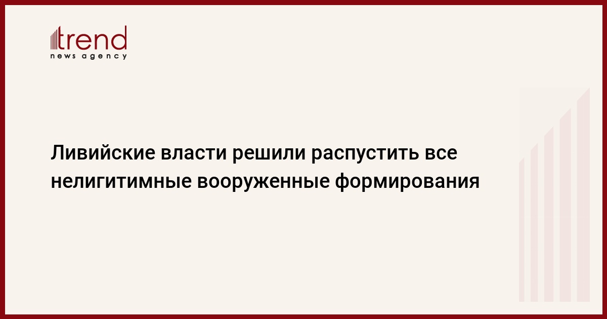 Власти Ливии решили распустить все вооруженные формирования, не признанные властями легитимными, сообщает Франс Пресс со ссылкой на председателя ливийского Всеобщего национального конгресса Мухаммеда Юсуфа аль-Макрифа.