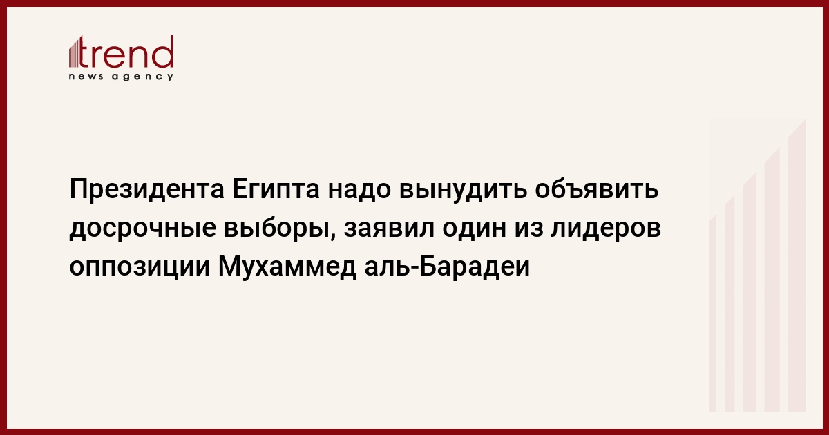 Все противники президента Египта Мухаммеда Мурси должны выйти сегодня на улицы городов страны, чтобы заставить главу государства объявить досрочные президентские выборы. С таким призывом выступил в субботу лауреат Нобелевской премии мира /2005/, лидер партии "Ад-Дустур" Мухаммед аль-Барадеи, сообщает ИТАР-ТАСС.