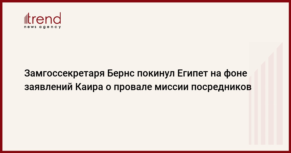 Первый заместитель госсекретаря США Уильям Бернс в среду покинул Египет вскоре после того, как египетские власти объявили о провале международных посреднических усилий по урегулированию кризиса в стране, передает агентство Рейтер.