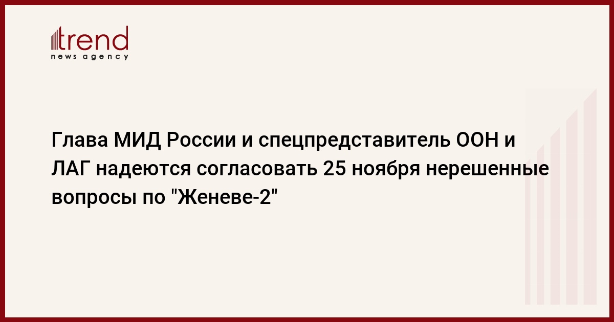Глава МИД России Сергей Лавров и спецпредставитель ООН и ЛАГ по Сирии Лахдар Брахими надеются согласовать на встрече РФ-США-ООН в Женеве 25 ноября нерешенные вопросы по созыву конференции по Сирии "Женева-2", в том числе - по ее участникам, передает РИА Новости со ссылкой на сообщение департамента информации и печати МИД России.