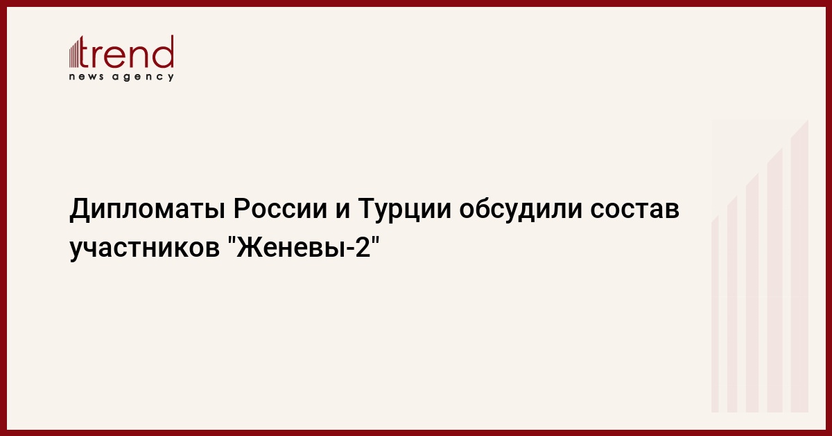 Спецпредставитель президента РФ по Ближнему Востоку, заместитель министра иностранных дел России Михаил Богданов и первый заместитель министра иностранных дел Турции Фирудин Синирлиоглу обсудили в Москве состав участников международной конференции по Сирии, получившей название "Женева-2", передает РИА Новости со ссылкой на департамент информации и печати МИД России.
