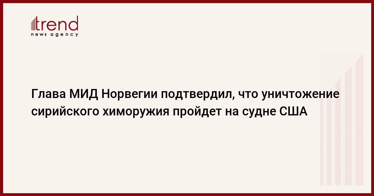 "Норвегия тесно сотрудничает с ОЗХО и Россией, и мы следим за тем, чтобы усилия увенчались успехом. Чрезвычайно важную роль сыграет один американский корабль, когда дело дойдет до уничтожения химического оружия", - заявил Бренде по итогам переговоров с министром иностранных дел РФ Сергеем Лавровым.