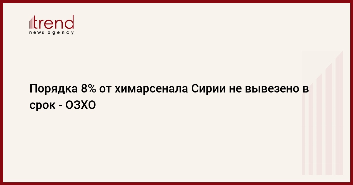 Глава совместной миссии ООН и ОЗХО Зигрид Кааг заявила, что к завершению оговоренного с Дамаском срока вывоза из Сирии химарсенала в стране осталось порядка 8% химических веществ, сообщает РИА Новости со ссылкой на агентство Франс Пресс.