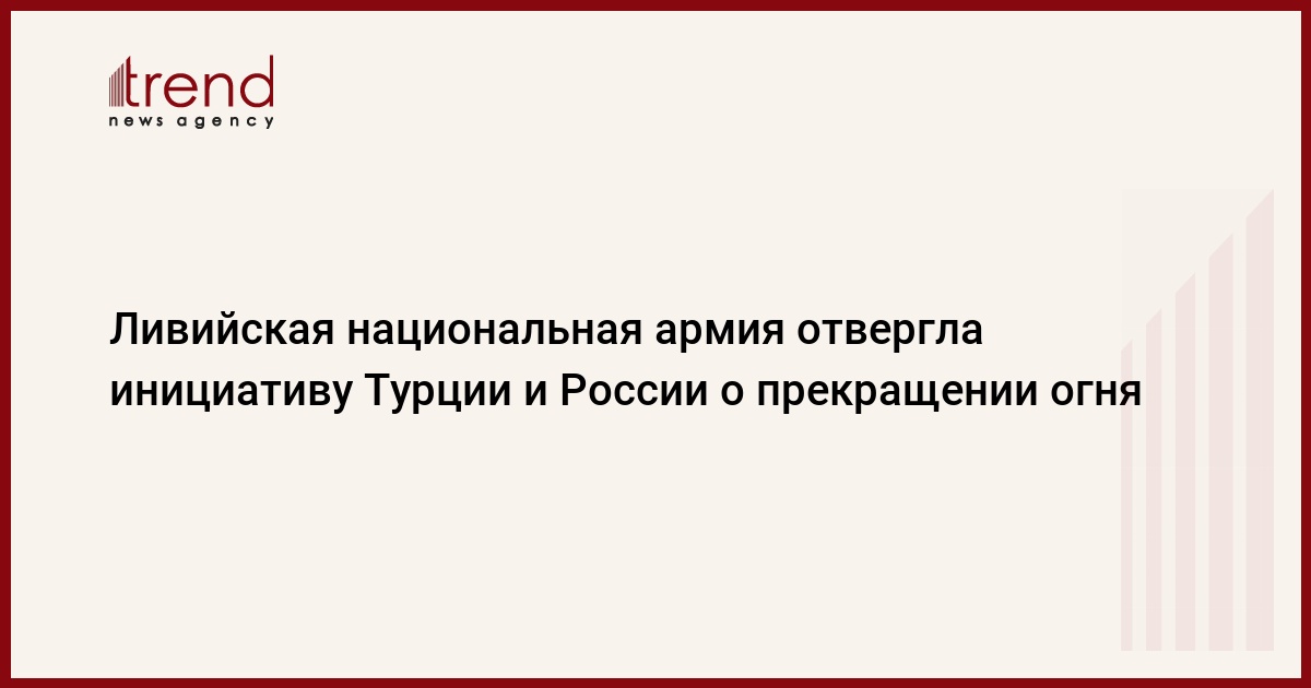 Ливийская национальная армия (ЛНА) Халифы Хафтара отвергла в четверг российско-турецкую инициативу о прекращении огня. Об этом сообщил официальный представитель ВС Ливии генерал Ахмед аль-Мисмари, передает телеканал Al Arabiya, передает Trend со ссылкой на ТАСС.