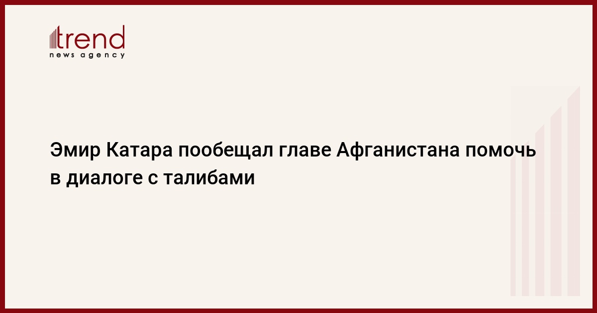 Эмир Катара Тамим бен Хамад Аль Тани в телефонном разговоре во вторник вечером с президентом Афганистана Ашрафом Гани пообещал продолжить усилия, чтобы наладить диалог между афганским правительством и движением "Талибан" для достижения мирного соглашения между ними. Об этом, как передает Trend со ссылкой на ТАСС, сообщило Катарское агентство новостей QNA.