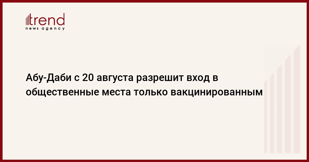 Посещение общественных мест в Абу-Даби с 20 августа будет разрешено только вакцинированным от коронавируса людям. Об этом сообщил в понедельник Комитет по кризисным и чрезвычайным ситуациям эмирата, передает телеканал Al Arabiya, передает Trend со ссылкой на ТАСС.