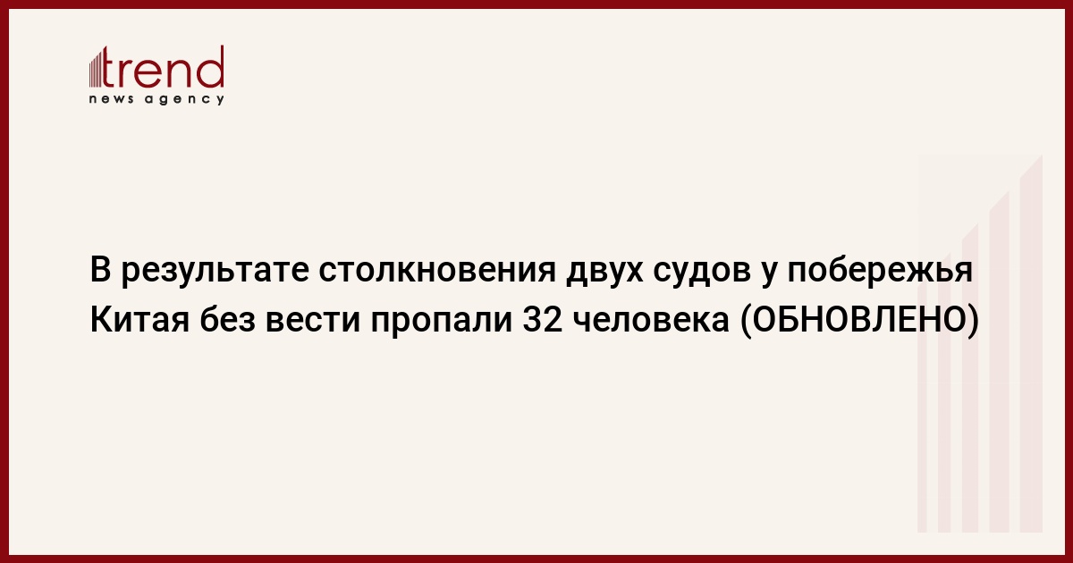 08:06 (GMT+4) Два судна столкнулись у восточного побережья Китая, десятки членов экипажа считаются пропавшими без вести, сообщает в воскресенье РИА Новости со ссылкой на агентство Синьхуа.