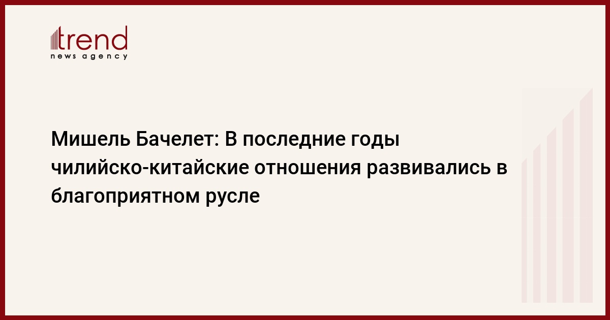 Как сообщает агентство Синьхуа, Бачелет заявила, что в последние годы чилийско-китайские отношения развивались в благоприятном русле. Две страны установили всеобъемлющее стратегическое партнерство, подписали протокол о повышении уровня двустороннего соглашения о свободной торговле и достигли новых результатов во взаимовыгодном сотрудничестве в различных областях. Всестороннее углубление сотрудничества с Китаем стало консенсусом всех политических партий Чили. По словам Бачелет, инициатива "Пояс и путь" предоставила Латинской Америке новые возможности развития. Чили готова сыграть активную роль для содействия совместному участию Латинской Америки и Китая в реализации этой инициативы.