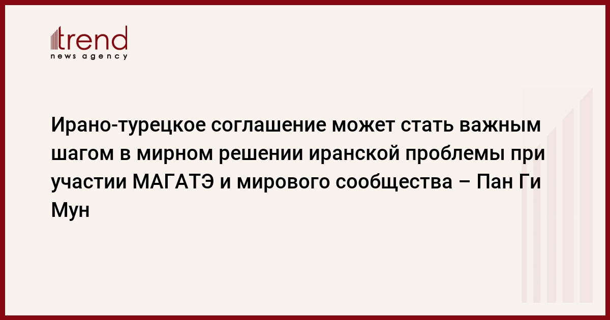 В случае участия в разрешении проблемы МАГАТЭ и мирового сообщества, заключение этого соглашения может служить важным шагом в направлении урегулирования иранской проблемы путем диалога, сказал генеральный секретарь ООН Пан Ги Мун, выступая с заявлением по поводу соглашения об обмене ядерным топливом, заключенного между Ираном, Турцией и Бразилией, пишет турецкое агентство Anadolu.