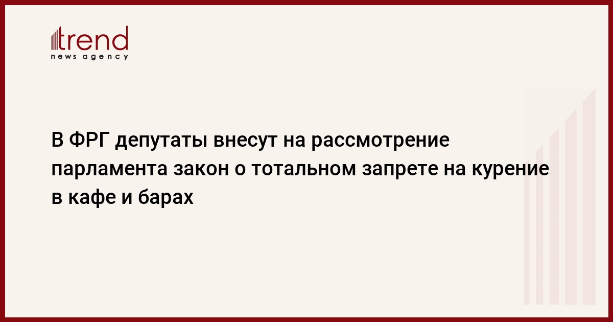 Группа депутатов бундестага из разных фракций намерена к началу 2011г. внести на рассмотрение парламентариев законопроект об общефедеральном повсеместном запрете курения в кафе и барах. Об этом сообщила председатель комитета бундестага по здравоохранению, социал-демократ Карола Райман.