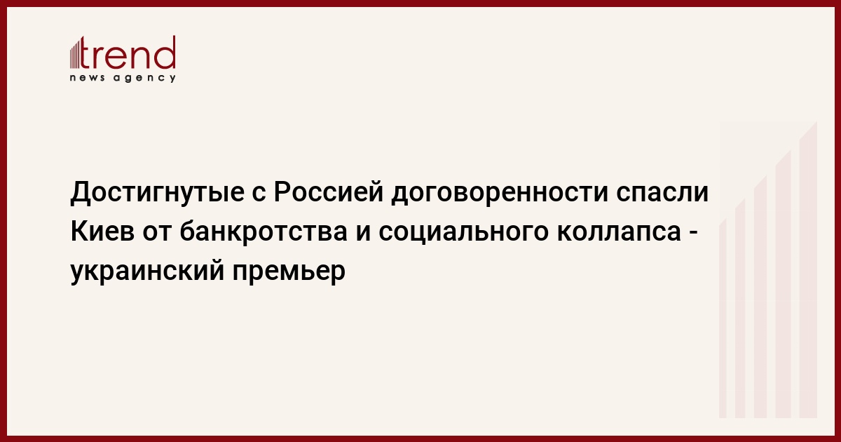 Украину без договоренностей с Россией, которые были достигнуты во вторник во время визита президента страны Виктора Януковича в Москву, ожидало бы банкротство и социальный коллапс, передает в среду РИА Новости со ссылкой на заявление украинского премьер-министра Николая Азарова.
