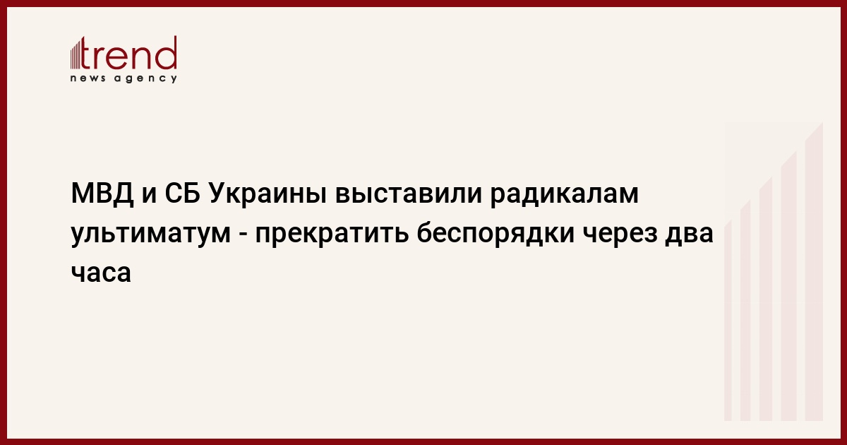 Председатель службы безопасности Украины и исполняющий обязанности главы МВД страны заявили, что если к 18.00 по киевскому времени (20.00 мск) беспорядки в городе не прекратятся, службы будут обязаны навести порядок способами, предусмотренными законом, сообщает РИА Новости со ссылкой на сайт СБУ.