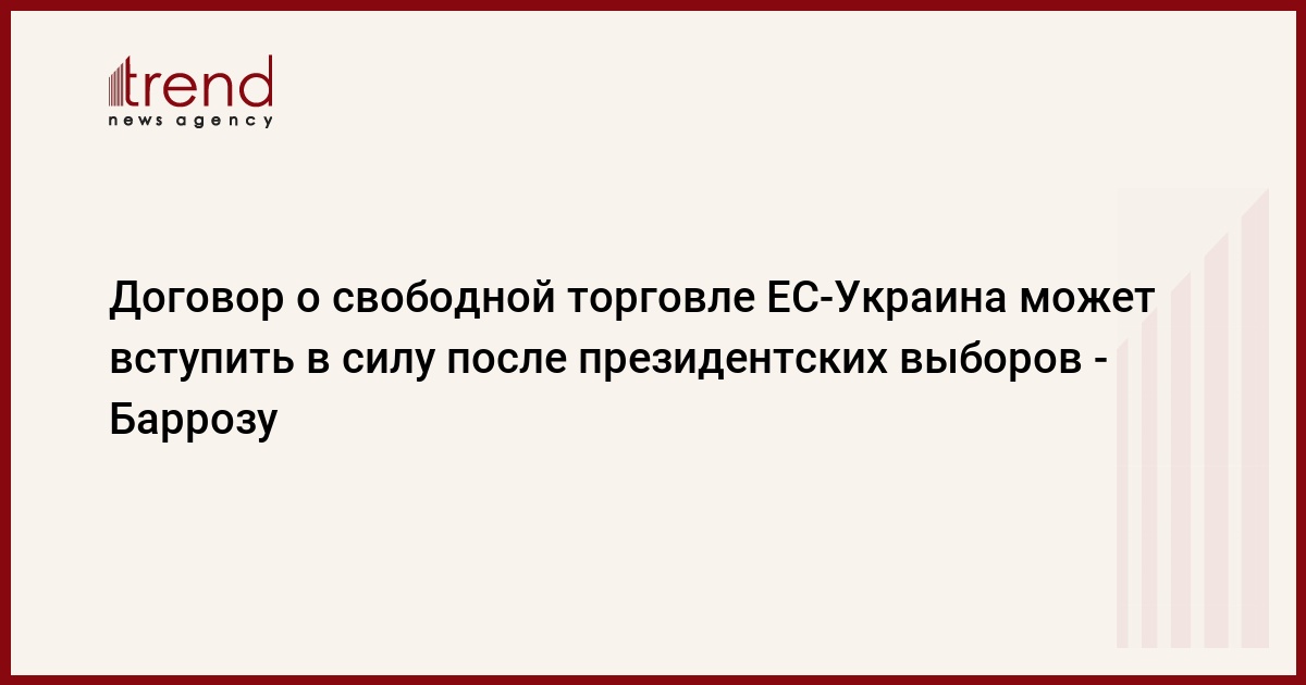 Соглашение о свободной торговле между Евросоюзом (ЕС) и Украиной, которое является частью соглашения об ассоциации, может вступить в силу после президентских выборов в стране, назначенных на 25 мая, сказал председатель Еврокомиссии (ЕК) Жозе Мануэл Баррозу, выступая в Европарламенте, передает в среду РИА Новости.