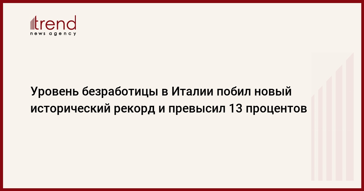 Уровень безработицы в Италии побил новый исторический рекорд. Согласно распространенным данным Национального института статистики, безработные составляют 13 процентов трудоспособного населения страны, передает ИТАР-ТАСС.