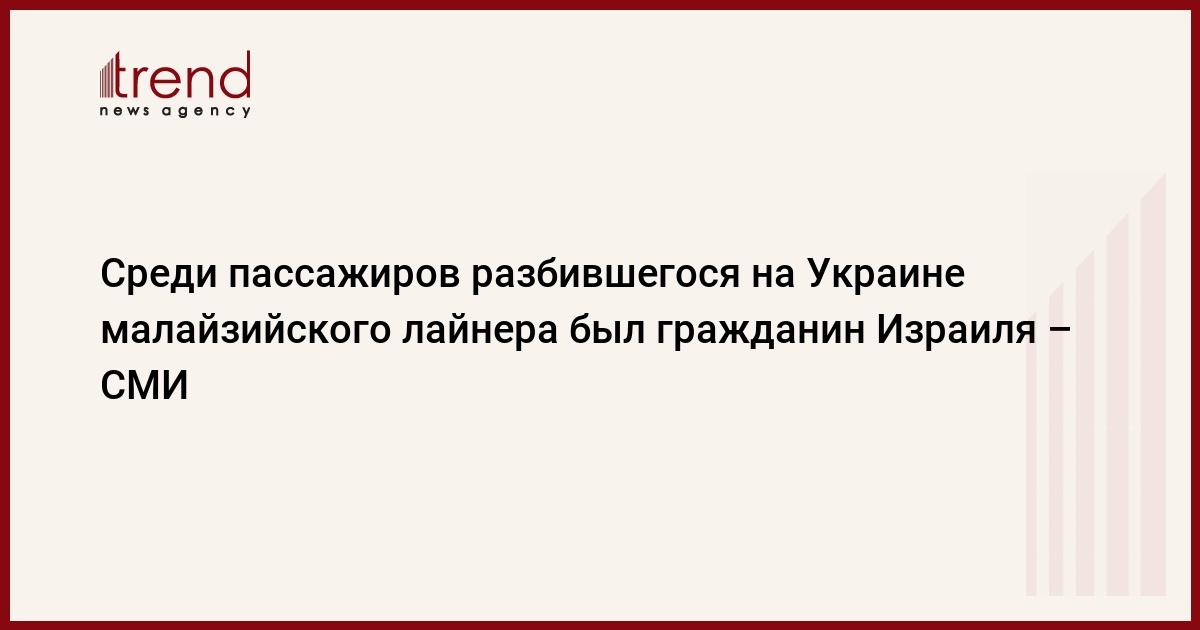 Среди пассажиров на борту потерпевшего катастрофу над территорией Украины малайзийского Boeing 777 находился один гражданин Израиля, передает ИТАР-ТАСС со ссылкой на израильские СМИ.