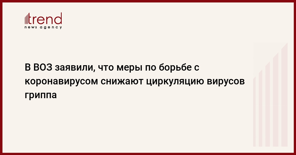 Меры, принимаемые властями для сдерживания распространения коронавирусной инфекции, оказались эффективными в борьбе с гриппом. Об этом во вторник сообщила журналистам главный специалист Всемирной организации здравоохранения по реагированию на чрезвычайные ситуации Катрин Смолвуд на брифинге Европейского регионального бюро ВОЗ, передает Trend со ссылкой на ТАСС.